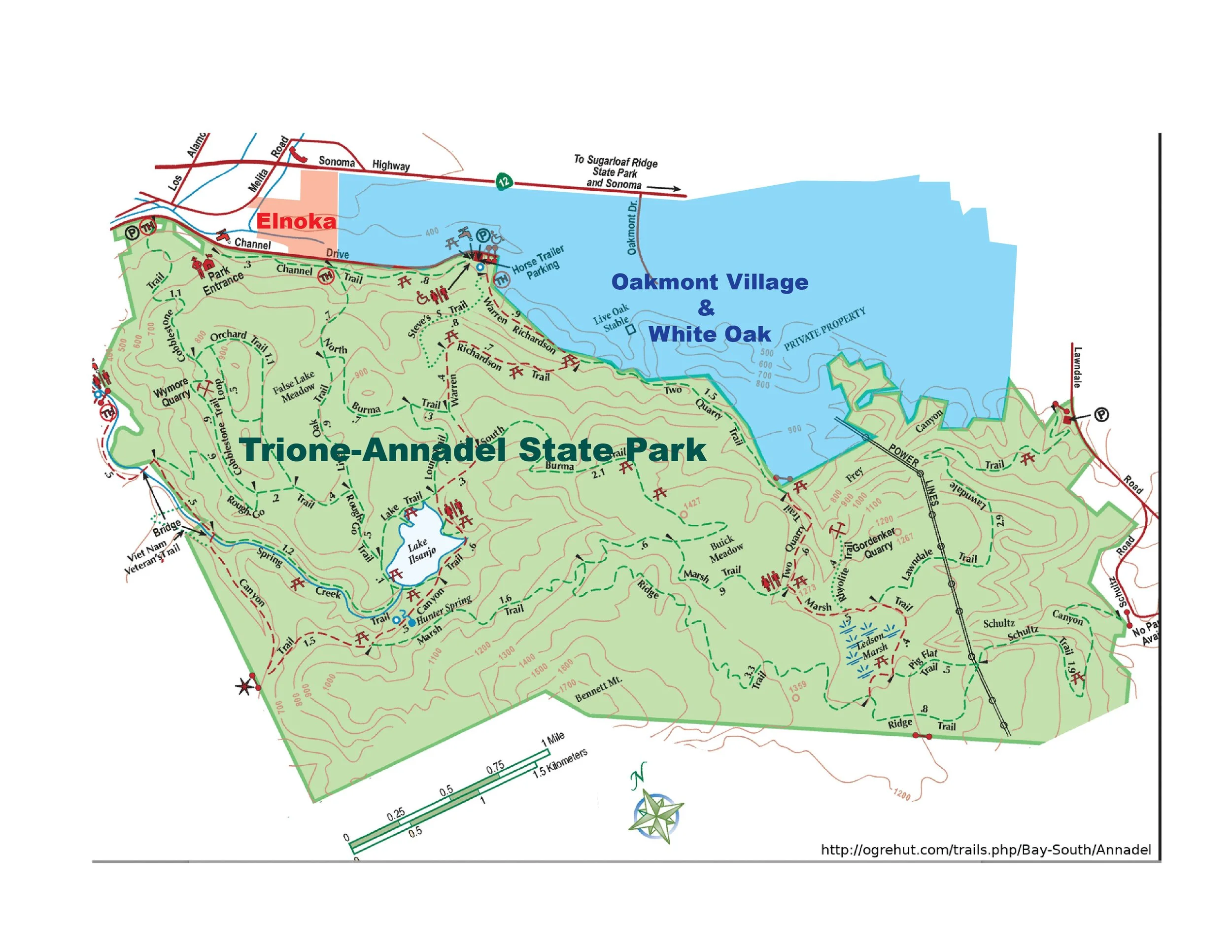 Above: Elnoka wildland in pink, Oakmont Village in blue, Trione-Annadel State Park in green.